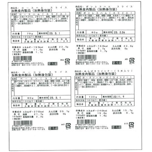 ■規格:ロースハムスライス79g、ボンレスハムスライス80g、ベーコンスライス80g、あらびきウインナー130g、ブラートブルスト120g、ハム用ドレッシング140ml