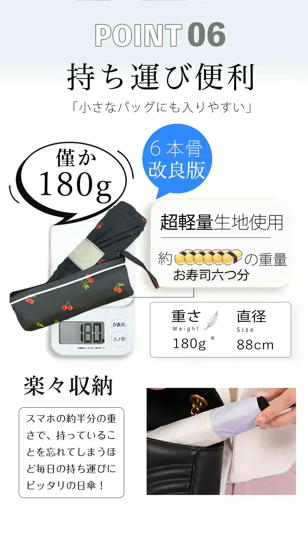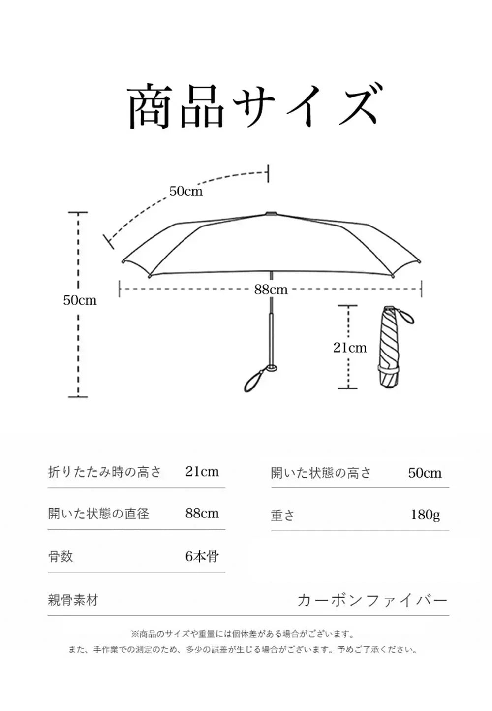 高級傘にしか使わない厳選されたカーボンファイバー採用し、直径88cmの大きさで完全遮光なのに重さはわずか180gです! スマホの約半分の重さで、持っていることを忘れてしまうほど毎日の持ち運びにピッタリの日傘!