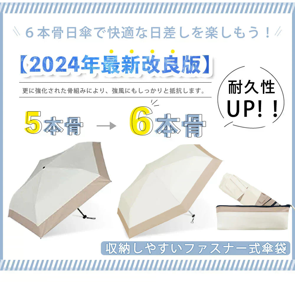 今までの傘は軽量化をすれば強度が下がり、丈夫にすると重くなっていましたが、こちらの日傘シリーズは強度や耐久性に優れた素材が採用され、繊細な職人技によって丁寧に仕上げられているため、軽さを実現しつつ、強度や耐久性にも配慮して設計しており、風速20m/sまで耐えられる丈夫なフレーム構造になっています。 万が一強い風で裏返っても、折りたためば元に戻れます。 また、素材選びから製造まで、徹底した品質管理の下で作り上げられてるため、日焼けによる劣化の心配もなく、耐久性が通常傘の約1.7倍です。