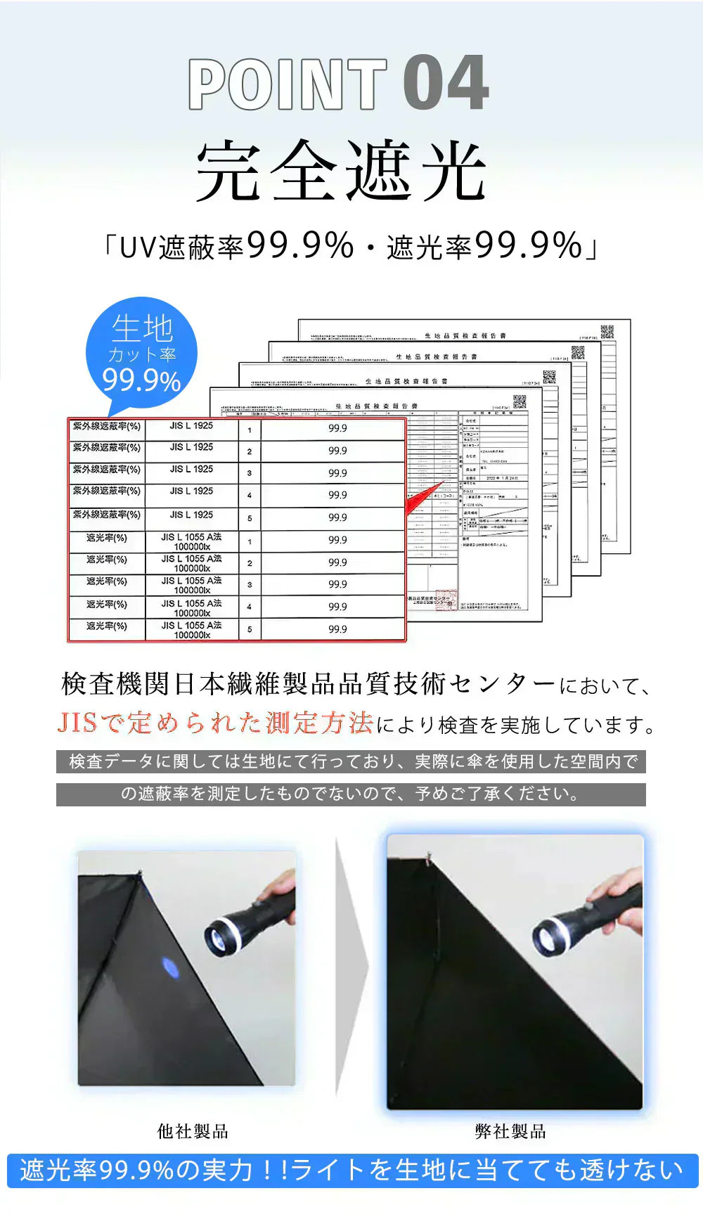 デュアルコーティングを施され、表は明るめのカラーで強い日差しや紫外線を反射して熱をこもらず、裏は黒で太陽光をまったく通さず、地面からの照り返しを顔に当たらないように吸収しながら、まぶしさを軽減します。 UVカット率は99.9%、UPF50+、完全遮光の高機能日傘です。