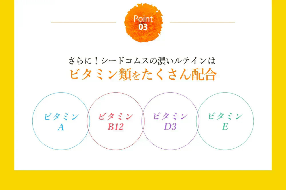 こめ油(国内製造)、アマニ油、エゴマ油、ゼラチン、グリセリン、グリセリン脂肪酸エステル、ミツロウ、マリーゴールド色素(ルテイン含有)、ビタミンE、ビタミンA、ビタミンB12、ビタミンD3