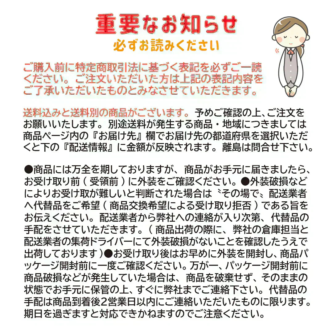 ●長期不在や住所確認等により配送業者との連絡がつかない場合、配送業者の保管期限を過ぎたお荷物を受け取ることができなくなります。ご注文時は必ず日中に連絡がとれるお電話番号をご入力ください。