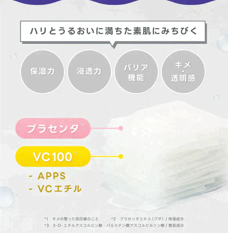 水、イソペンチルジオール、BG、グリセリン、プラセンタエキス(ブタ)、3-O-エチルアスコルビン酸、パルミチン酸アスコルビルリン酸3Na、加水分解エラスチン、水溶性プロテオグリカン、ナイアシンアミド、加水分解ヒアルロン酸、ヒアルロン酸Na、エクトイン、セラミドAP、セラミドNP、チャ葉エキス、カンゾウ根エキス、ツボクサ葉/茎エキス、加水分解コラーゲン、ヒメフウロエキス、グリチルリチン酸2K、異性化糖、サッカロミセス溶解質エキス、ベタイン、酢酸トコフェロール、トコフェロール、PEG-60水添ヒマシ油、カルボマー、(アクリレーツ/アクリル酸アルキル(C10-30))クロスポリマー、水酸化Na、1,2-ヘキサンジオール、フェノキシエタノール、エチルへキシルグリセリン、クエン酸、クエン酸Na
