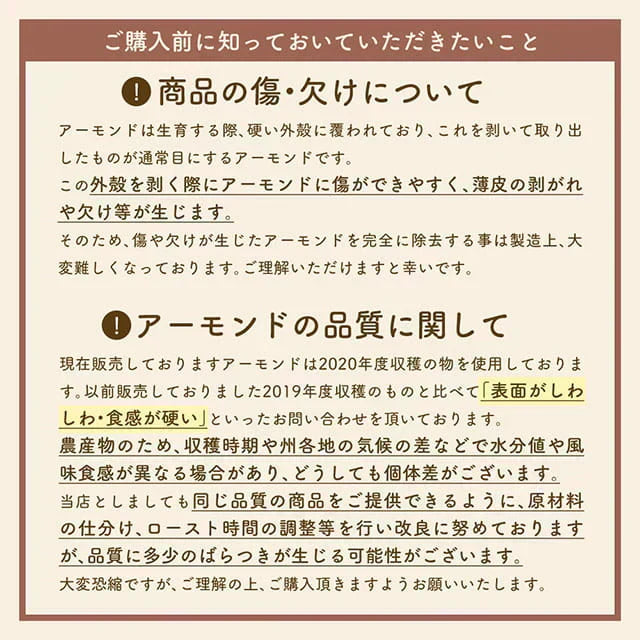 ≪ご注意≫使用しているアーモンドは粒の形が長く扁平な外観が特徴でございます。味が淡白で食感が柔らかいため、湿気たように感じる場合がございますが、アーモンドの品種によるもので品質には問題ございませんので、ご安心いただけますと幸いです。