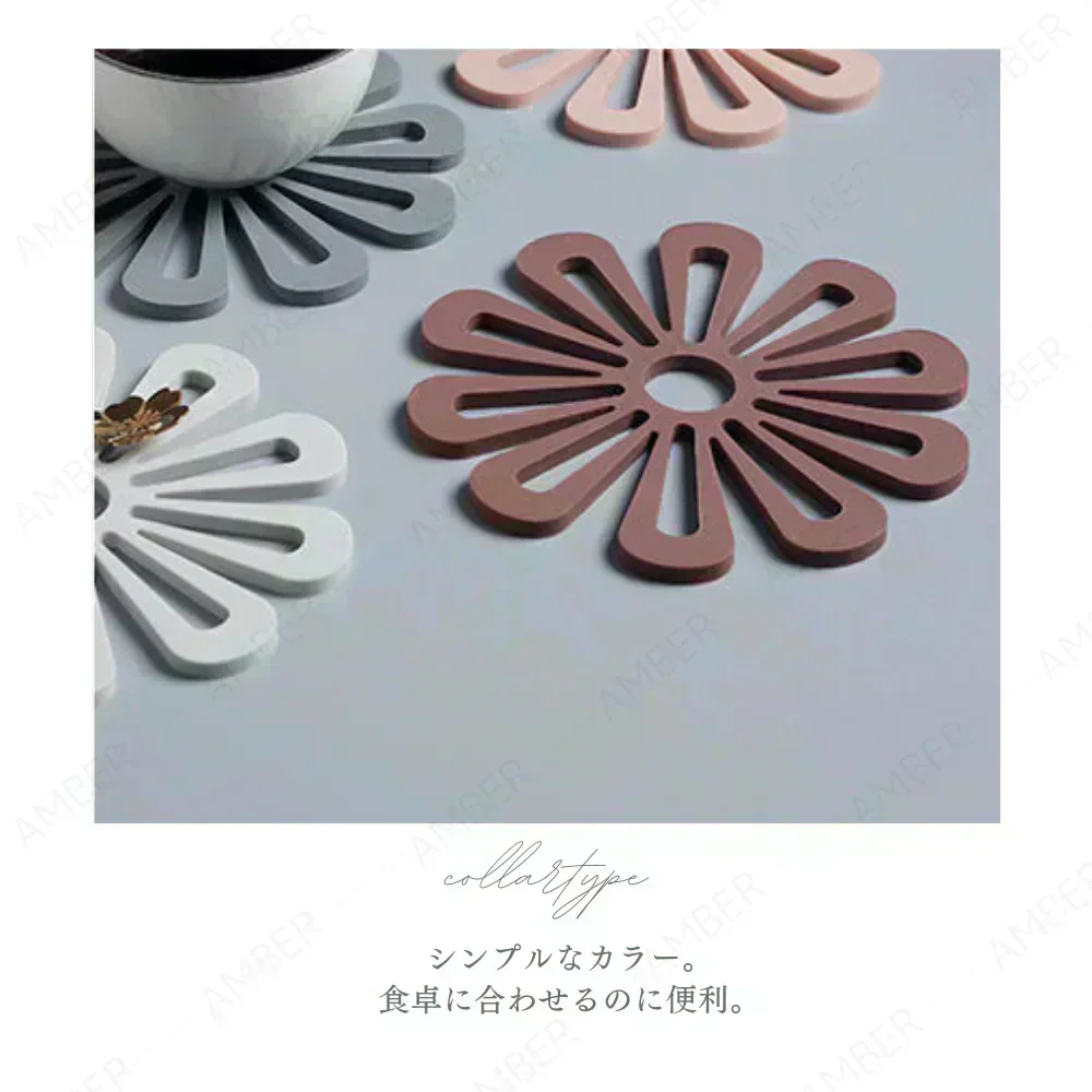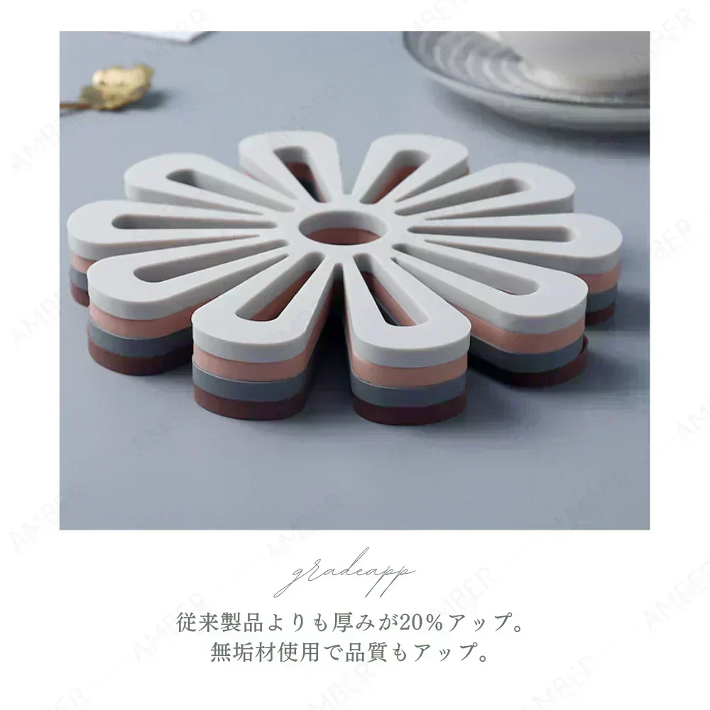 ・人気のおしゃれなキッチン雑貨、フラワーモチーフのシリコン鍋敷きになります。