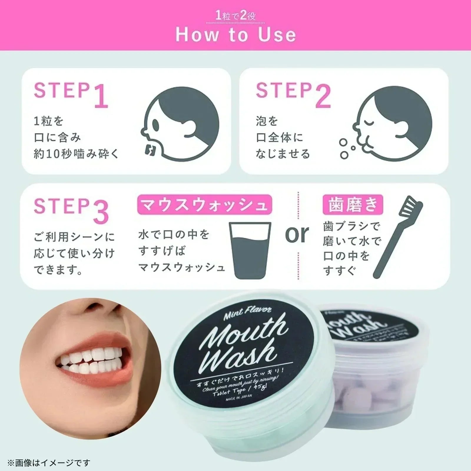 タブレット1粒を約10秒ほど噛み砕いてください。粒が溶けたら口をすすいで吐き出します。使用の際は飲み込まないようにご注意ください。