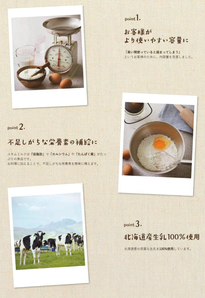また、スキムミルク10gを、90mlの水またはぬるま湯で溶くと、約100mlの無脂肪牛乳と同程度の濃さになりますので、無脂肪牛乳の代わりとしてお召し上がりいただけます。