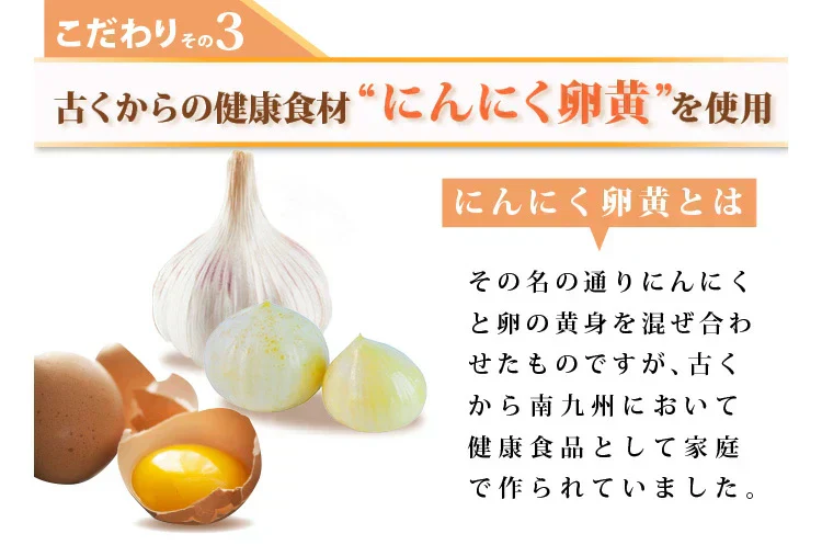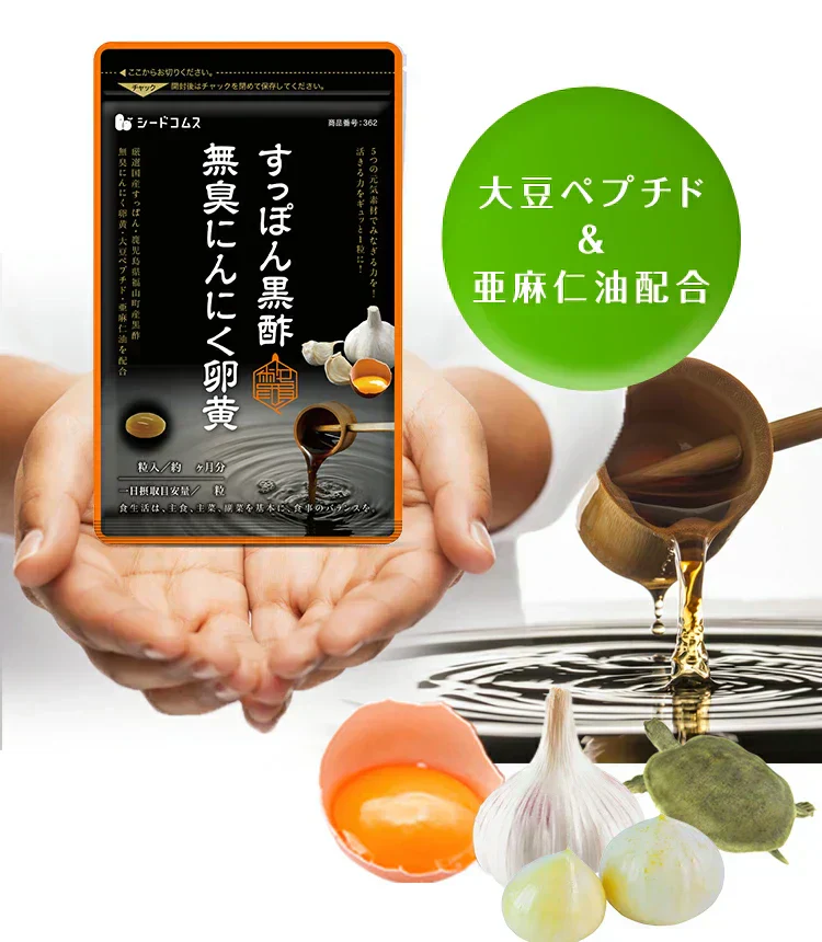 アマニ油(国内製造)、大豆ペプチド、卵黄末(卵を含む)、黒酢粉末、無臭にんにく末、スッポン粉末、黒 酢もろみ末、黒酢エキス末/ゼラチン、グリセリン、ミツロウ、グリセリン脂肪酸エステル、植物レシチン (大豆由来)