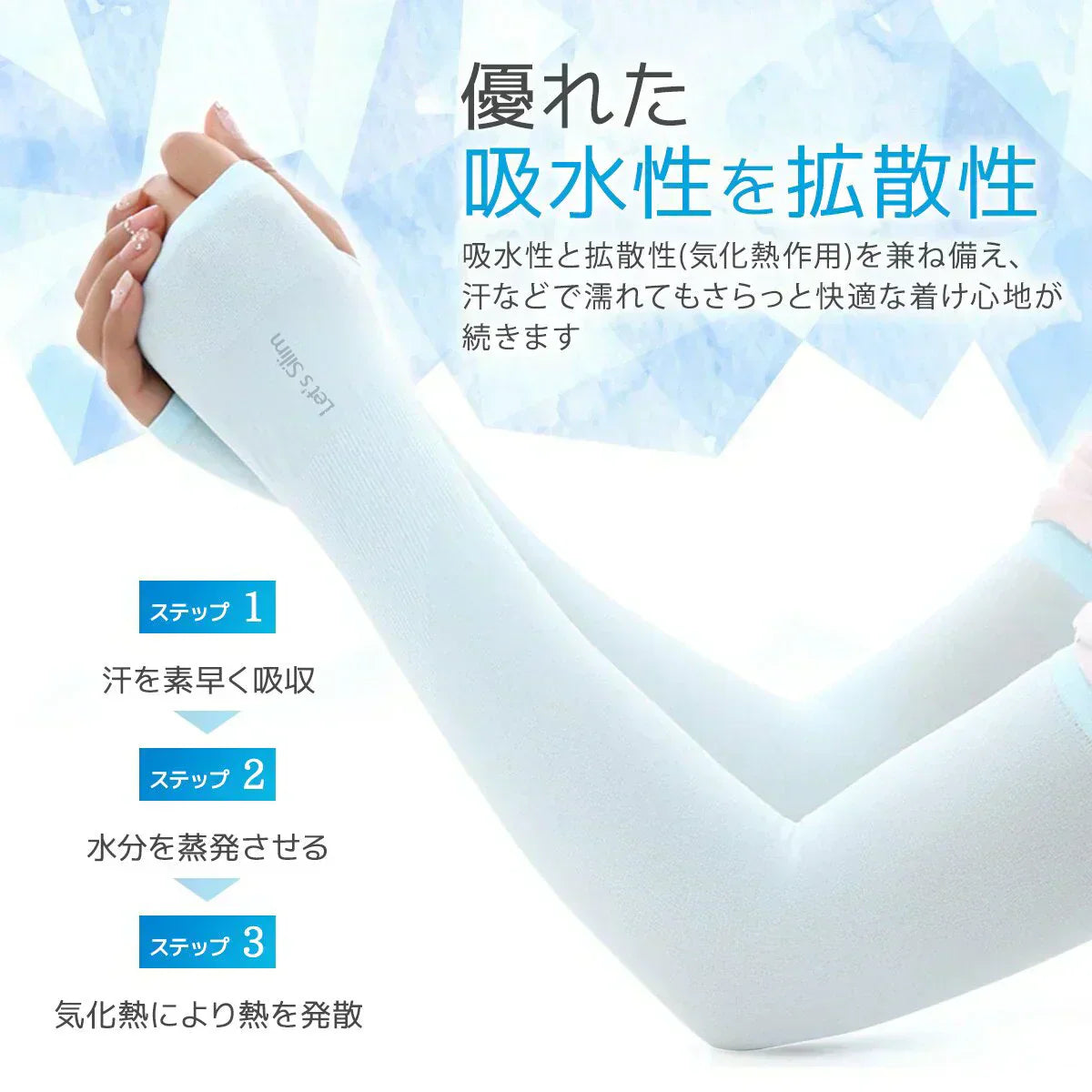 【Point.2】つけた瞬間ひんやり♪軽くてやわらかい肌触りさらに優れた吸水性と拡散性(気化熱作用)を兼ね備え、汗などで濡れてもさらっと快適な着け心地が続きます