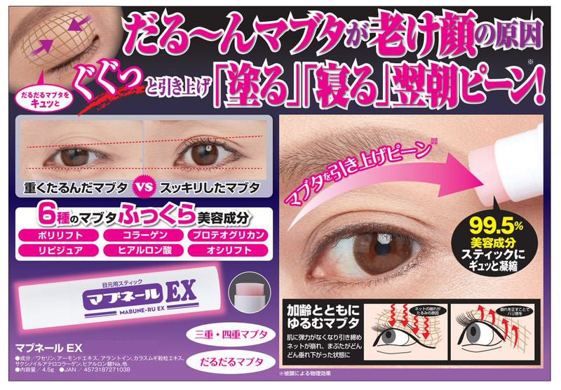 【マブネールEX】加齢とともに緩んでしまうまぶたに塗って寝ると翌朝にピーンとハリ感を感じられるまぶた専用のスティック美容液 目元 専用 スティック まぶた たるみ 老け顔 ケア 引き上げ 塗って寝るだけ 引き上げ 二重 三重 四重 6種の美容成分 ヒアルロン酸 コラーゲン 目元ケア アイケア コラーゲン ビタミン 目の下ケア ナイトケア 美容液 日本製 目元用スティック まぶた たるみ 老け顔 ナイアシンアミド 三重 四重まぶた