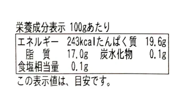 栄養成分 (100gあたり)エネルギー:243kcal、たんぱく質:19.6g、脂質:17.0g、炭水化物:0.1g、食塩相当量:0.1g