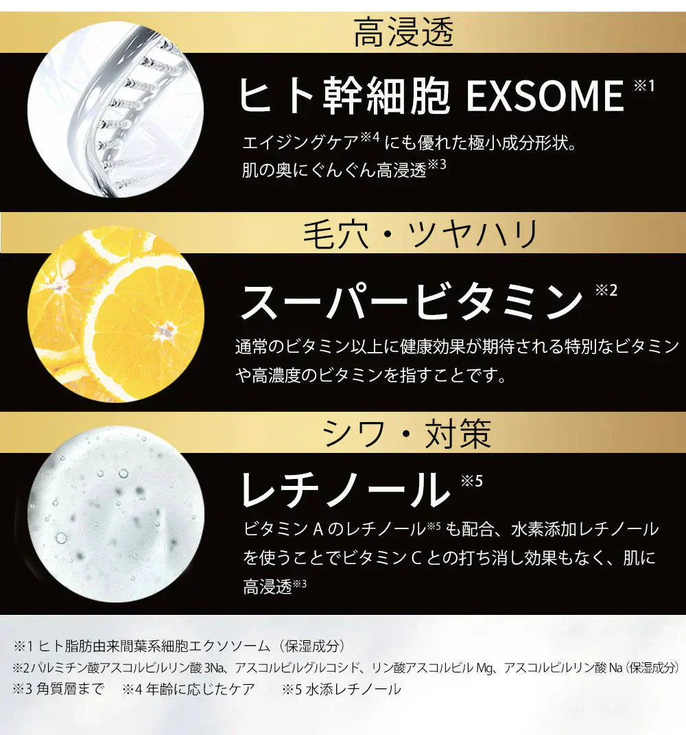 【成 分】水、グリセリン、DPG、BG、ヒト脂肪由来間葉系細胞エクソソーム、ヒト幹細胞順化培養液、パンテノール、パルミチン酸アスコルビルリン酸3Na、アスコルビルグルコシド、リン酸アスコルビルMg、アスコルビルリン酸Na、水添レチノール、トコフェロール、ナイアシンアミド、ヒアルロン酸Na、ニンニク根エキス、ローマカミツレ花エキス、ゴボウ根エキス、アルニカ花エキス、セイヨウキズタ葉/茎エキス、オドリコソウ花/葉/茎エキス、オランダガラシ葉/茎エキス、セイヨウアカマツ球果エキス、ローズマリー葉エキス、トレハロース、エチドロン酸4Na、キサンタンガム、ラベンダー油、レモン果皮油、ライム油、レモングラス油、エンピツビャクシン油、ローズマリー葉油、クエン酸、クエン酸Na、PEG-60水添ヒマシ油、メチルパラベン、フェノキシエタノール、水添レシチン、1,2-ヘキサンジオール、ポリソルベート80、カプリリルグリコール、酢酸トコフェロール、アスコルビルメチルカルボニルペンタペプチド-72-トリ-t-ブチルトリプトファナミド、トリ(カプリル酸/カプリン酸)グリセリル