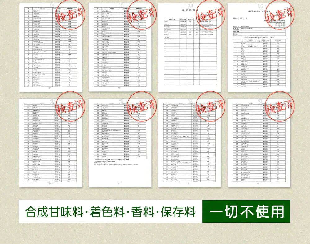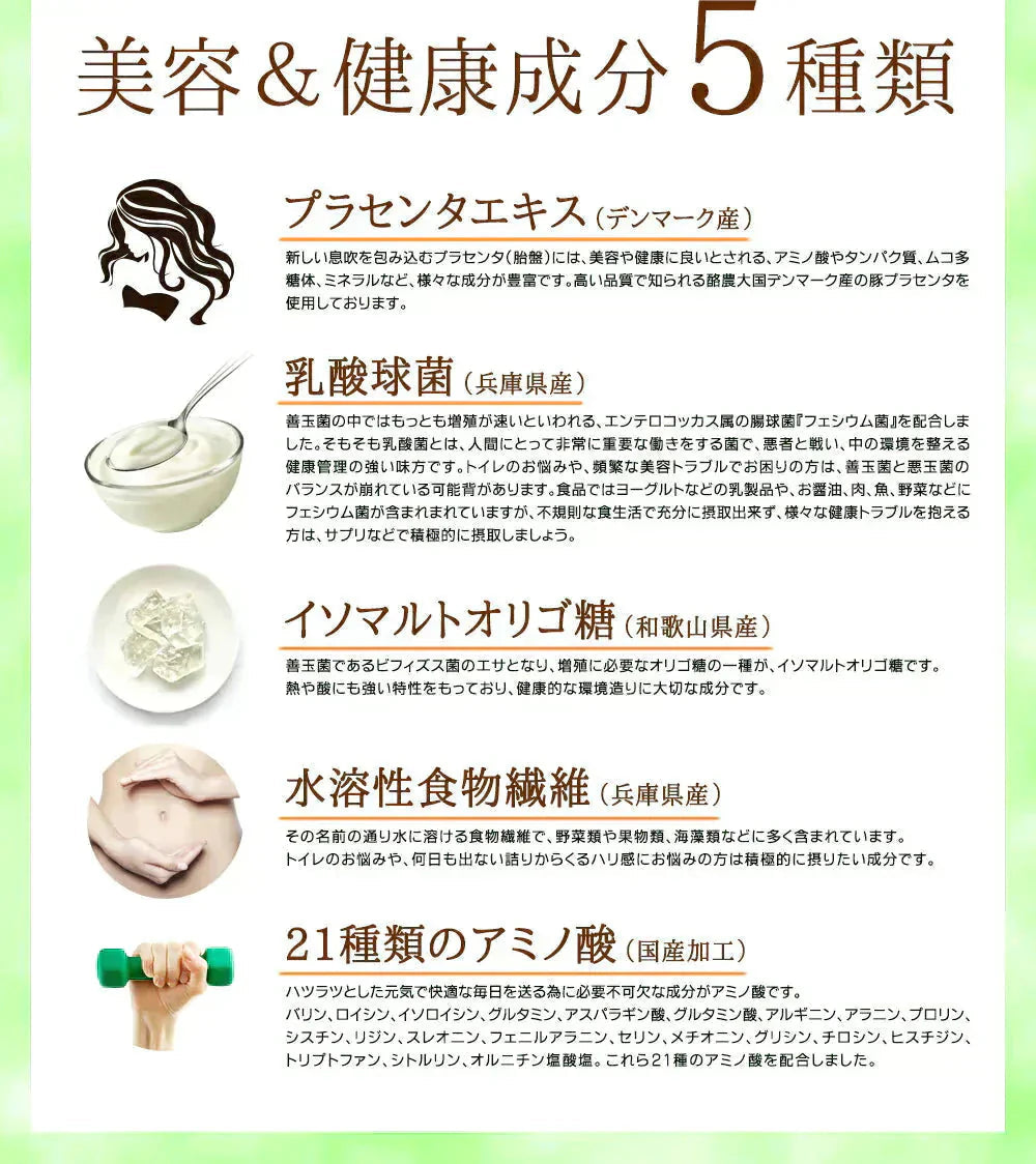 デキストリン(国内製造)、大麦若葉末、ケール末、抹茶末、ゴーヤ末、水溶性食物繊維、イソマルトオリゴ糖、豚プラセンタエキス末、乳酸菌(殺菌)、オルニチン塩酸塩、シトルリン/環状オリゴ糖、アラニン、アルギニン、アスパラギン酸Na、シスチン、グルタミン、グルタミン酸Na、ヒスチジン、イソロイシン、ロイシン、リジン塩酸塩、メチオニン、フェニルアラニン、プロリン、セリン、トレオニン、トリプトファン、チロシン、グリシン、バリン、(一部に豚肉を含む)