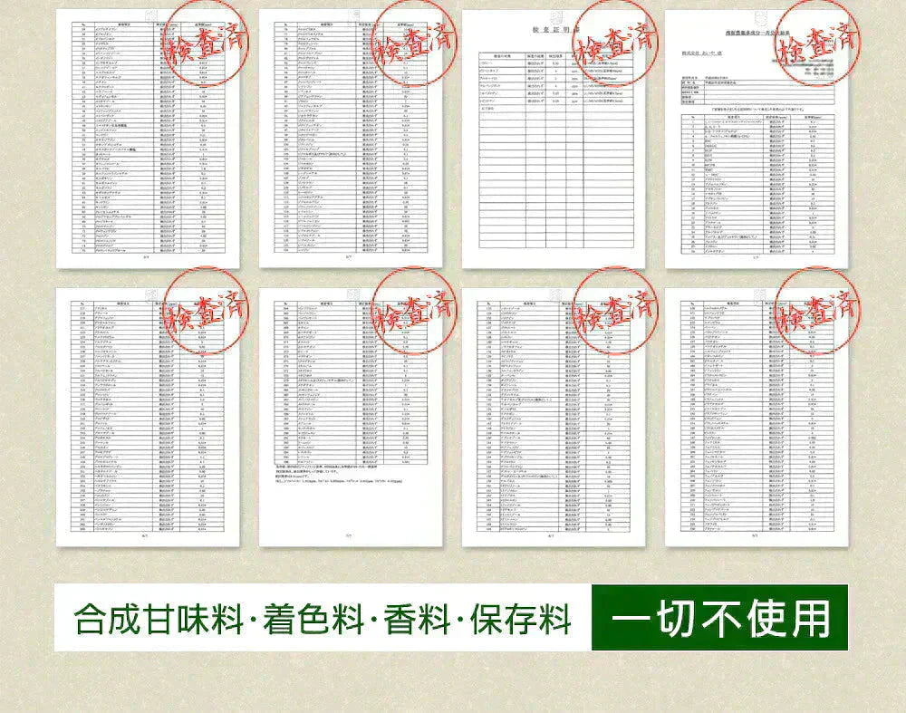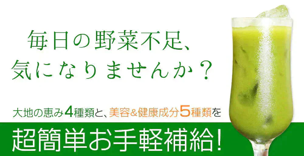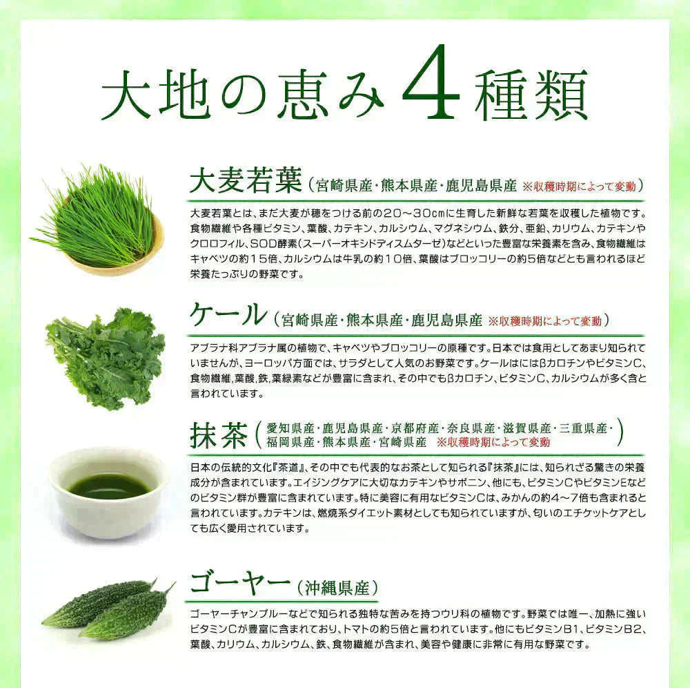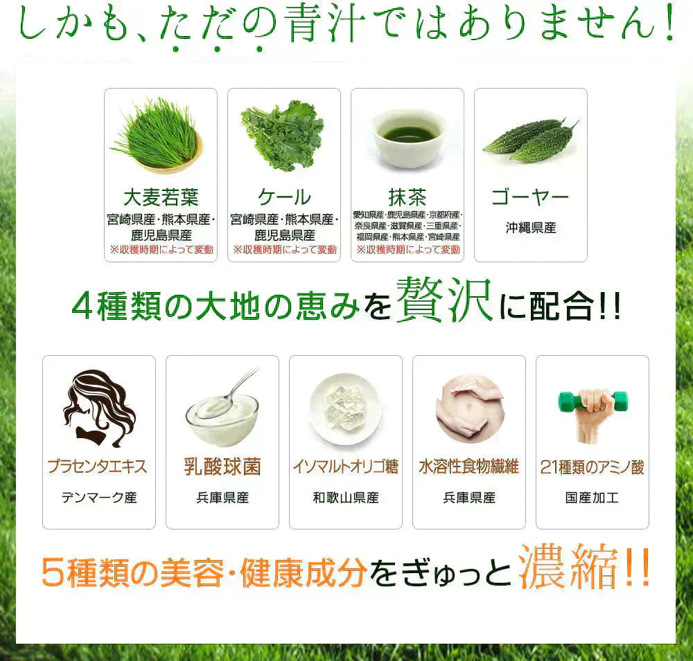 デキストリン(国内製造)、大麦若葉末、ケール末、抹茶末、ゴーヤ末、水溶性食物繊維、イソマルトオリゴ糖、豚プラセンタエキス末、乳酸菌(殺菌)、オルニチン塩酸塩、シトルリン/環状オリゴ糖、アラニン、アルギニン、アスパラギン酸Na、シスチン、グルタミン、グルタミン酸Na、ヒスチジン、イソロイシン、ロイシン、リジン塩酸塩、メチオニン、フェニルアラニン、プロリン、セリン、トレオニン、トリプトファン、チロシン、グリシン、バリン、(一部に豚肉を含む)