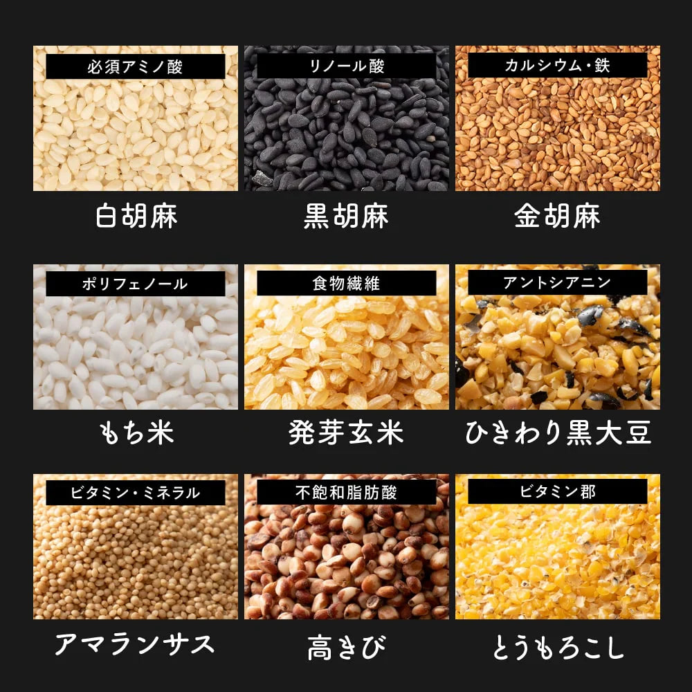黒米、大豆、もち米、赤米、発芽玄米、青大豆、緑米、小豆、きび、黒大豆、ひえ、高きび、とうもろこし、あわ、アマランサス、白胡麻、黒胡麻、金胡麻(一部に大豆・ごまを含む)
