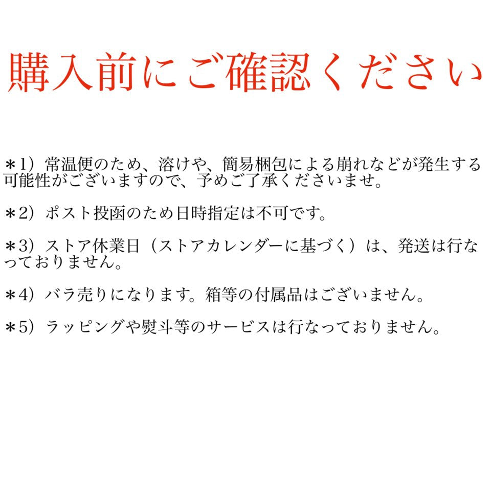 メール便発送のため、万一の事故の場合や溶けや形崩れなどは補償対象外となります。
