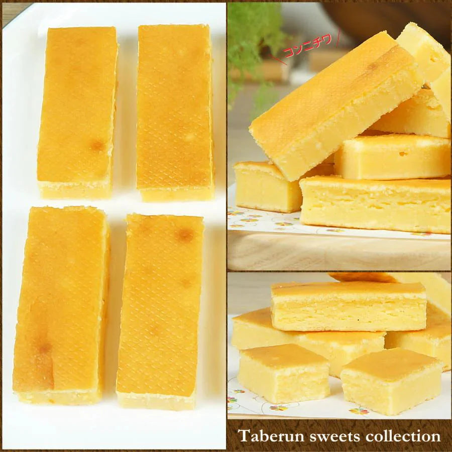 原材料名:砂糖(国内製造)、ナチュラルチーズ、全卵、マーガリン、小麦粉、卵白、牛乳、水飴、レモン果汁、食塩/乳化剤、安定剤(ローカストビーンガム)、酸化防止剤(V.E)、香料、着色料(カロテン)、(一部に卵・乳成分・小麦・大豆を含む)