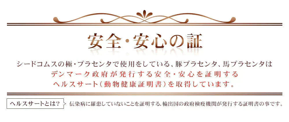 豚プラセンタエキス末(デンマーク製造)、食用ぶどう油、オリーブ油、サフラワー油、馬プラセンタエキス末、ビタミンE含有植物油、さけ白子抽出物、ビール酵母抽出物(RNA含有)、フィッシュコラーゲンペプチド、酵母エキス末/ゼラチン、グリセリン、ミツロウ、グリセリン脂肪酸エステル、β-カロテン、ヘム鉄、植物レシチン(大豆由来)、フェルラ酸、ビタミンB1、ビタミンB2、ビタミンB6、ビタミンB12