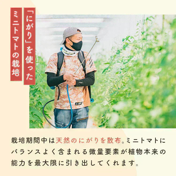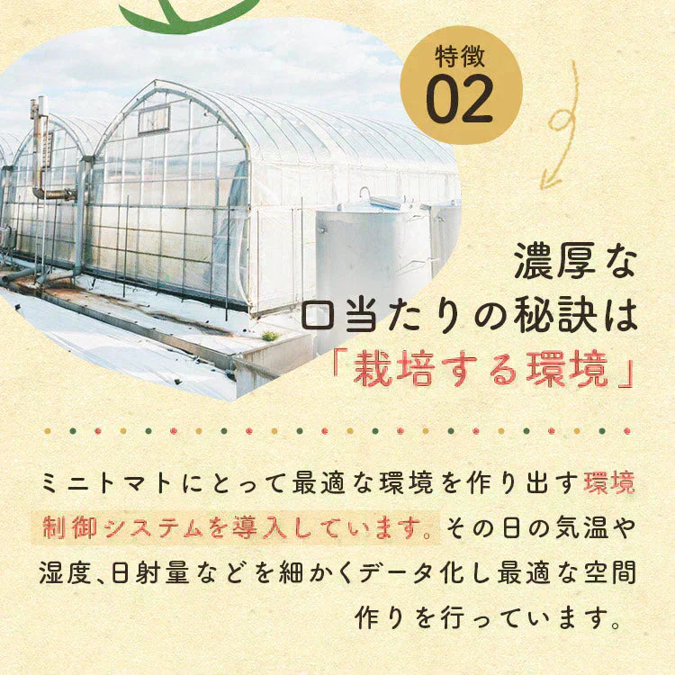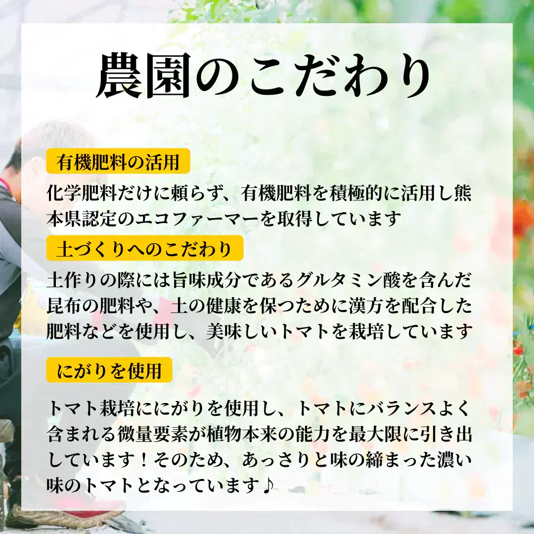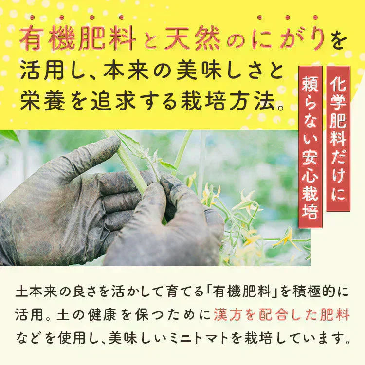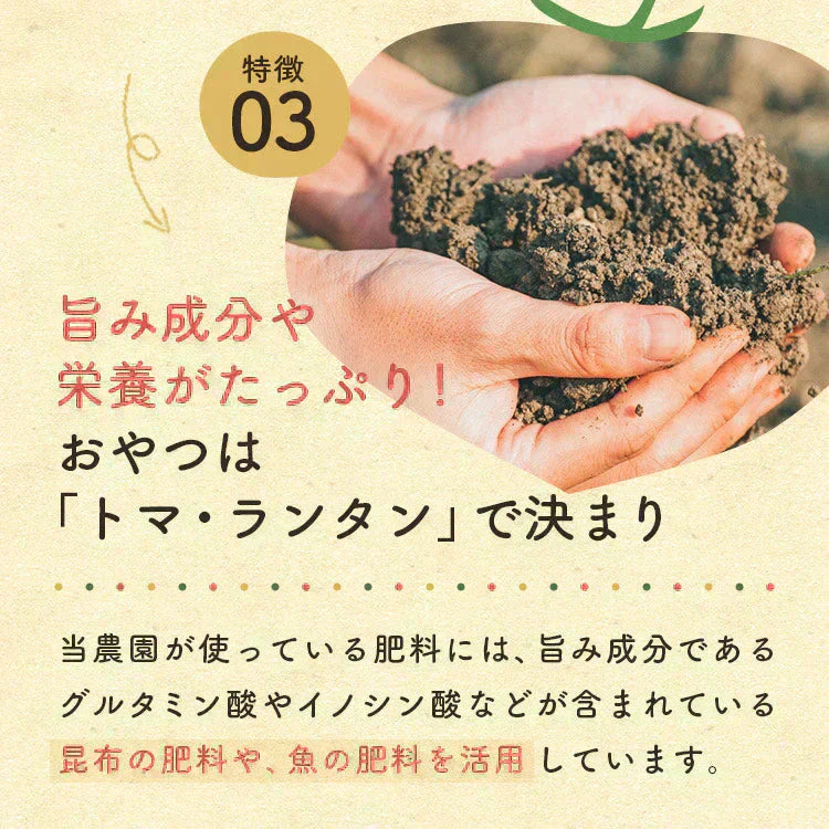「喜びと幸せを、食卓へ」 熊本県横島町でミニトマトを育てる「ベジライズ」です。 ミネラル豊富な干拓地の土と、地下から湧き出る天然水の恵みを活かし、化学肥料に頼りすぎず、有機肥料を中心に丁寧に栽培しています。 私たちは、月の満ち欠けや潮汐など自然のリズムに合わせて作業時期を見極める“月のリズム栽培”を取り入れています。 自然の流れに寄り添うことで、樹のバランスが整い、味わい深く実の詰まったミニトマトに育ちます。 完熟した実だけを、その日のうちに収穫・出荷。 噛むほどに甘みと旨味が広がり、ほどよい酸味が後味を引き締めます。 甘み・旨み・酸味のバランスが絶妙で、「気づいたら何個でも食べちゃう!」と人気です。 「お弁当に入れたら子どもが真っ先に食べた!」 「サラダがごちそうになった!」 そんな声が、私たちの一番の励みです。 ご家庭用にも、ちょっとした贈り物にもぴったり。 今日の食卓に“トマランタンのしあわせ”をどうぞ。