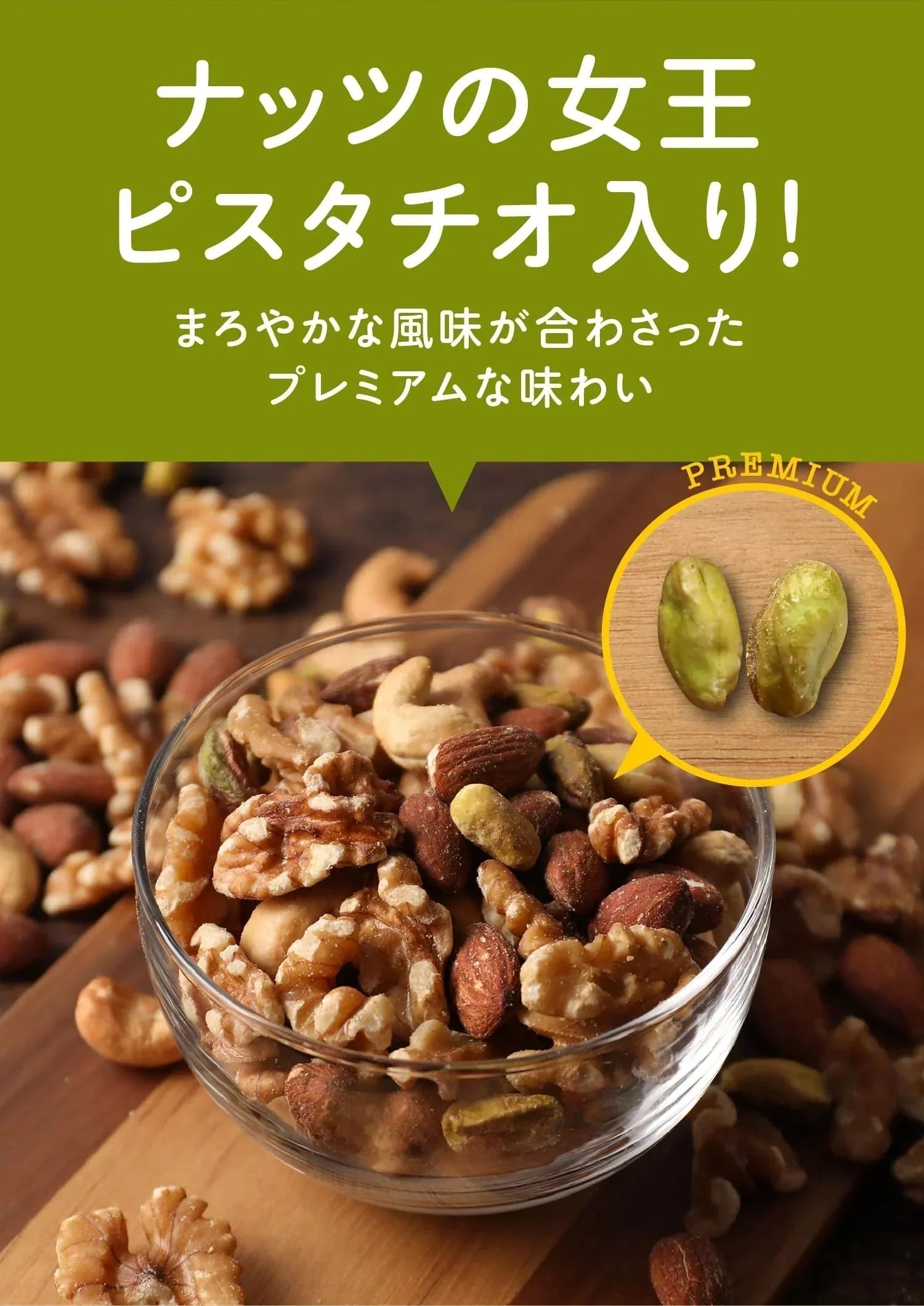 原材料名 生くるみ(アメリカ産)、アーモンド(アメリカ カリフォルニア産)、カシューナッツ(インド産又は、ベトナム産)、ピスタチオ(アメリカ産)