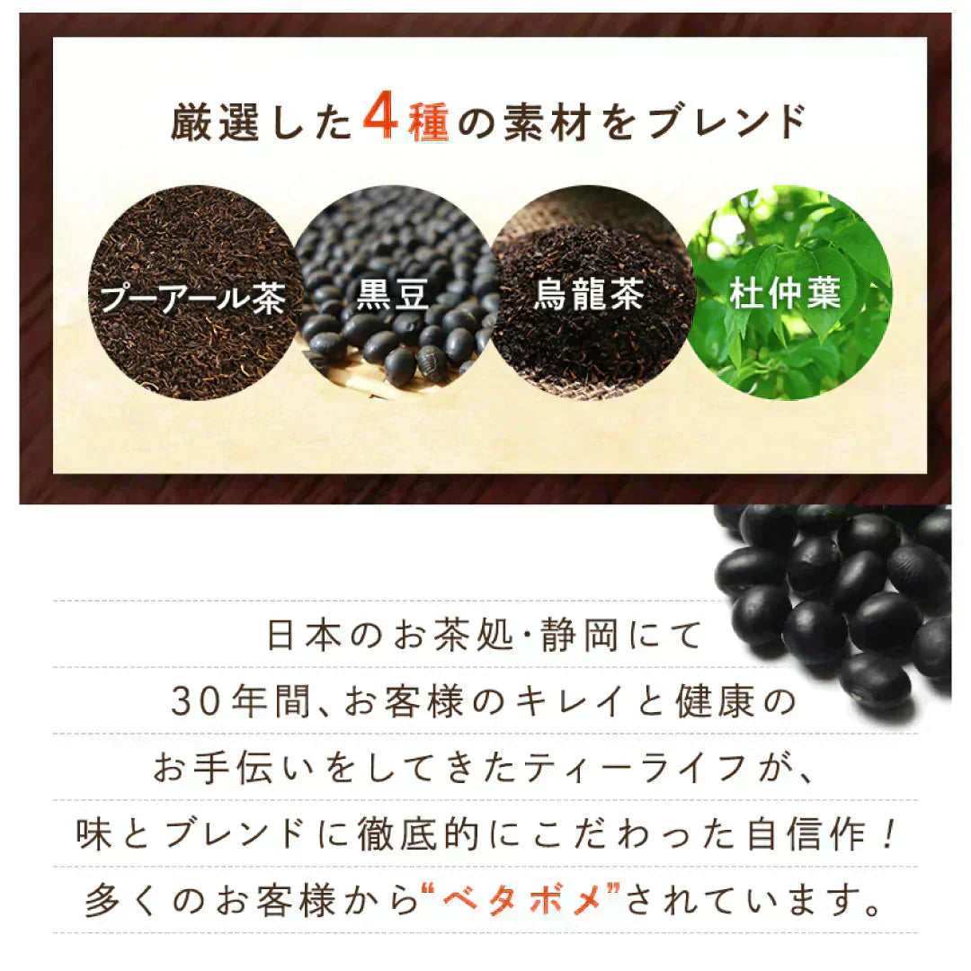 区分 原料(原産国):黒豆[大豆](アメリカ・国産)、プーアール茶・ウーロン茶・杜仲葉(中国)