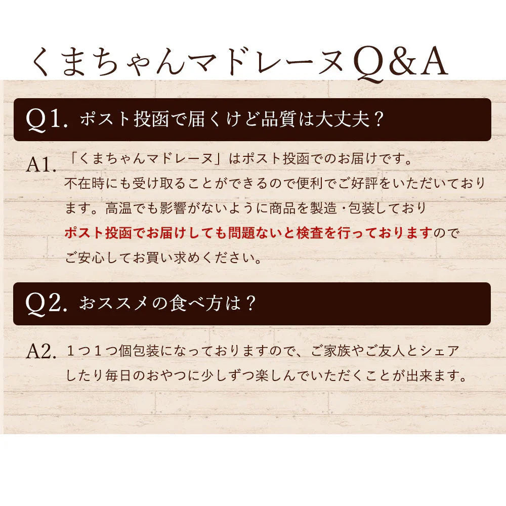 【ご注意】「くまちゃんマドレーヌ」の原料として使用されている「アーモンドプードル」には、ごく少量(約1%)のアーモンド皮を含むことがあります。そのため製品に小さな点が見える場合がございますが、これはアーモンドの自然な部分であり、製品の品質や風味には影響を与えません。安心してお召し上がりいただける事をお約束いたします。