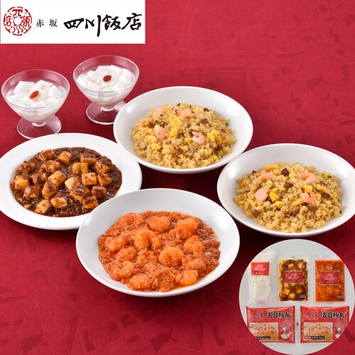 ■規格:本格四川麻婆豆腐150g×1、ふっくら五目炒飯(200g×2)×1、乾焼蝦仁(エビチリソース)150g×1、杏仁豆腐500g×1