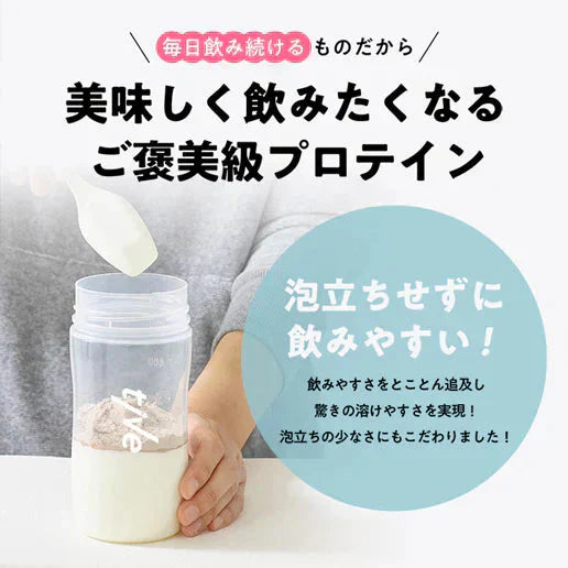 吸収が早く低カロリーな「ホエイプロテイン(動物性)」と、吸収がゆっくりで腹持ちが良くダイエット志向の方向きな「ソイプロテイン(植物性)」のW配合!