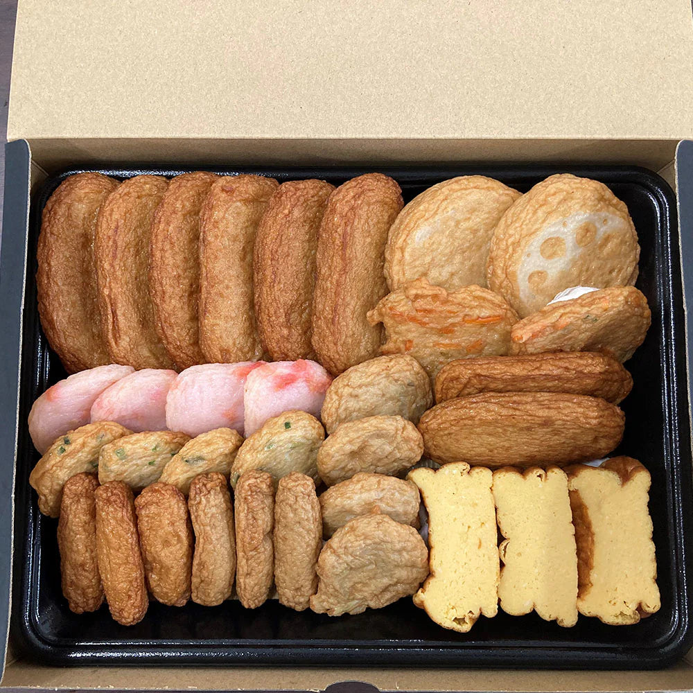 ■規格:にら天×4、紅しょうが天×4、ごぼう天×4、特上揚×6、髙浜焼×3、野菜天×2、上棒天×3、小判揚×2、れんこん天×2、いわし棒天×3