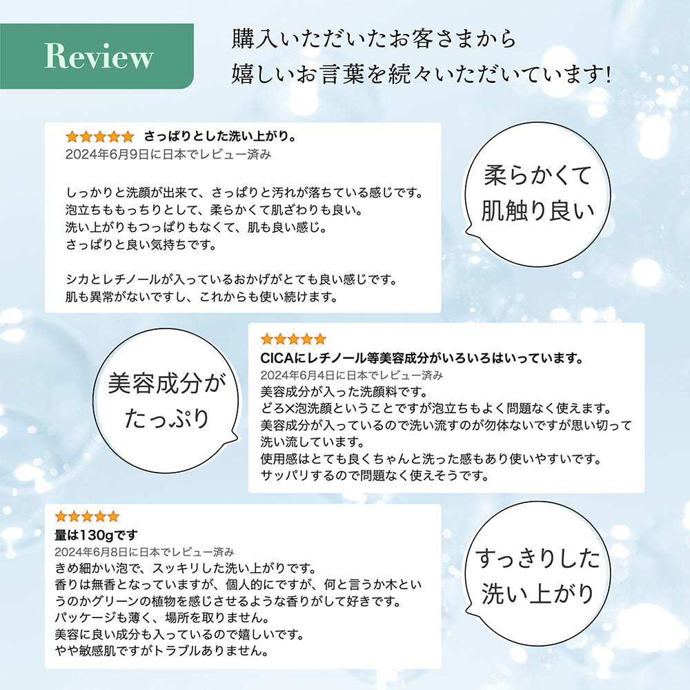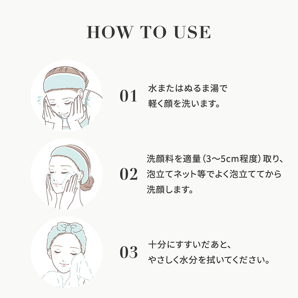適量を水かぬるま湯で泡立てて洗顔し、十分にすすいでください。