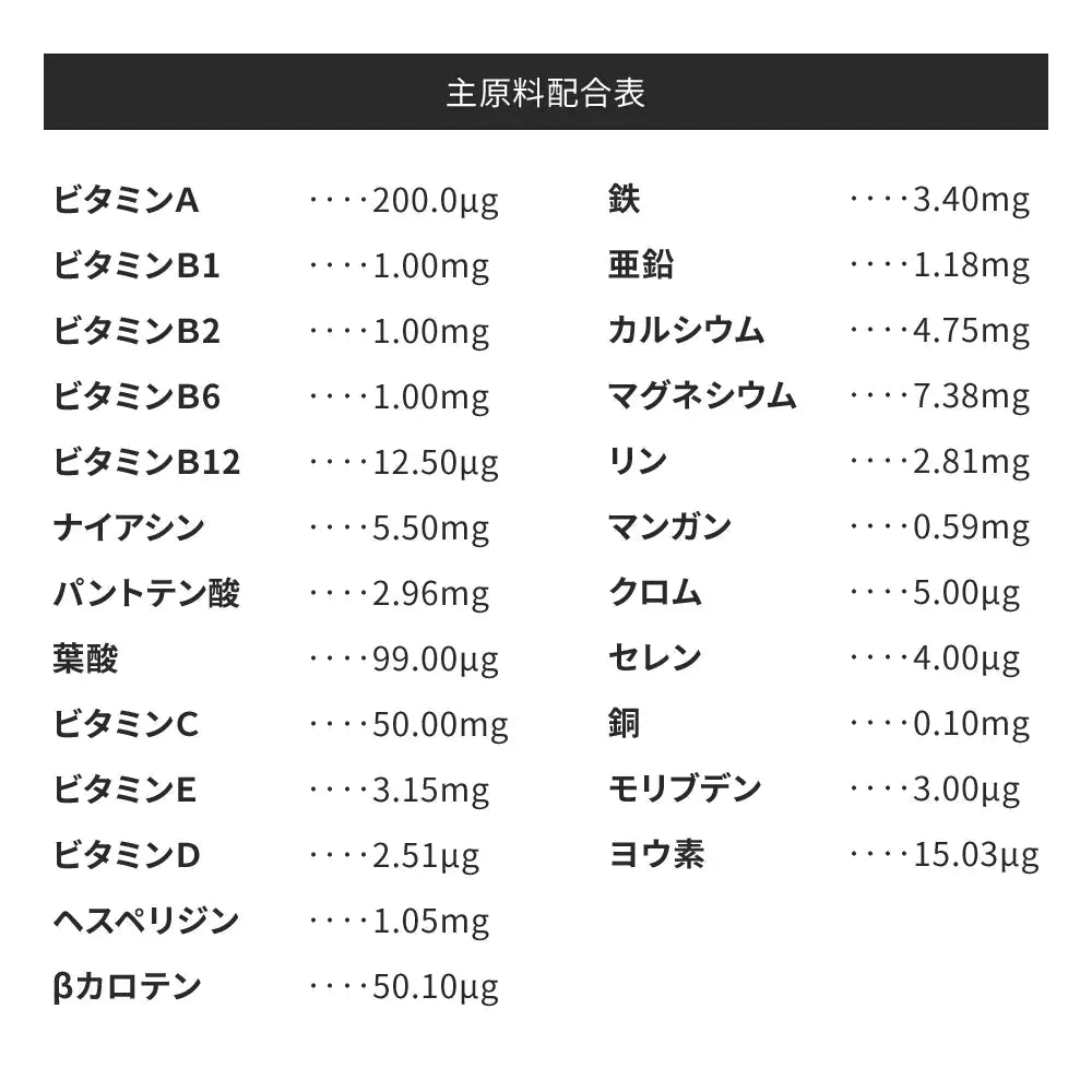 還元麦芽糖水飴(国内製造)、亜鉛含有酵母、マンガン含有酵母、クロム含有酵母、銅含有酵母、セレン含有酵母、モリブデン含有酵母、ヨウ素含有酵母/結晶セルロース、V.C、酸化マグネシウム、貝カルシウム、ステアリン酸カルシウム、ナイアシン、微粒二酸化ケイ素、ピロリン酸鉄、V.E、パントテン酸カルシウム、酵素処理ヘスペリジン、V.B1、V.B2、V.B6、V.A、葉酸、βーカロチン、V.B12、V.D、(一部に乳成分・ゼラチンを含む)