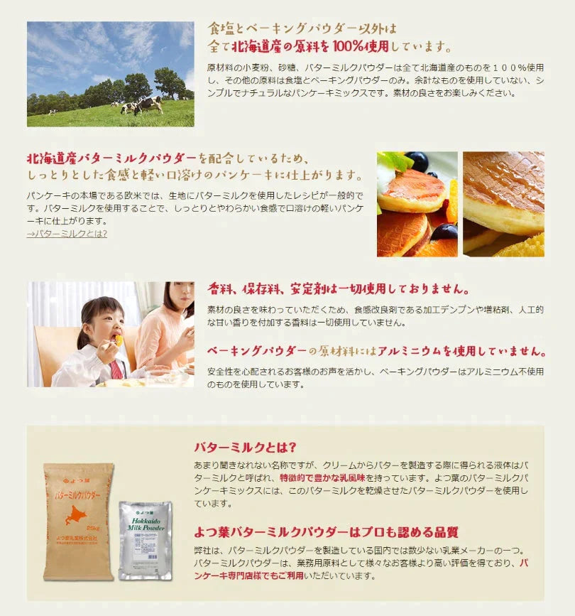 北海道産の原材料(小麦粉、砂糖、バターミルクパウダー)にこだわった、素材の良さが感じられる安全・安心なパンケーキミックスをよつ葉乳業が作りました。