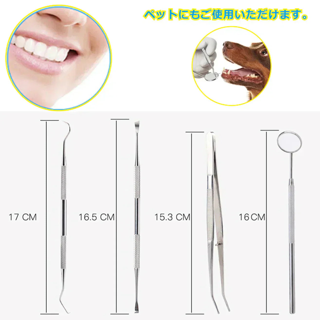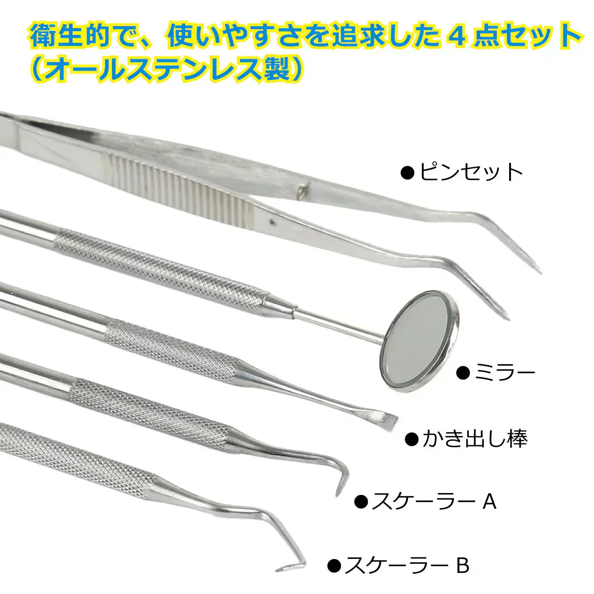 セット内容:ミラー、スケーラー、かき出し棒、ピンセット 各1個
