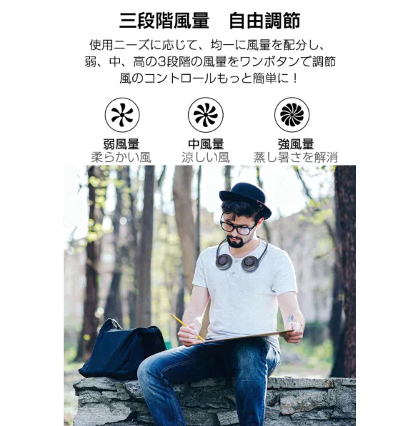 【3段階風量】首掛け携帯扇風機はお好みに合わせて弱/中/強の3段階の風量調節機能が搭載し、使うシーンによって自由に風量を調節できる。