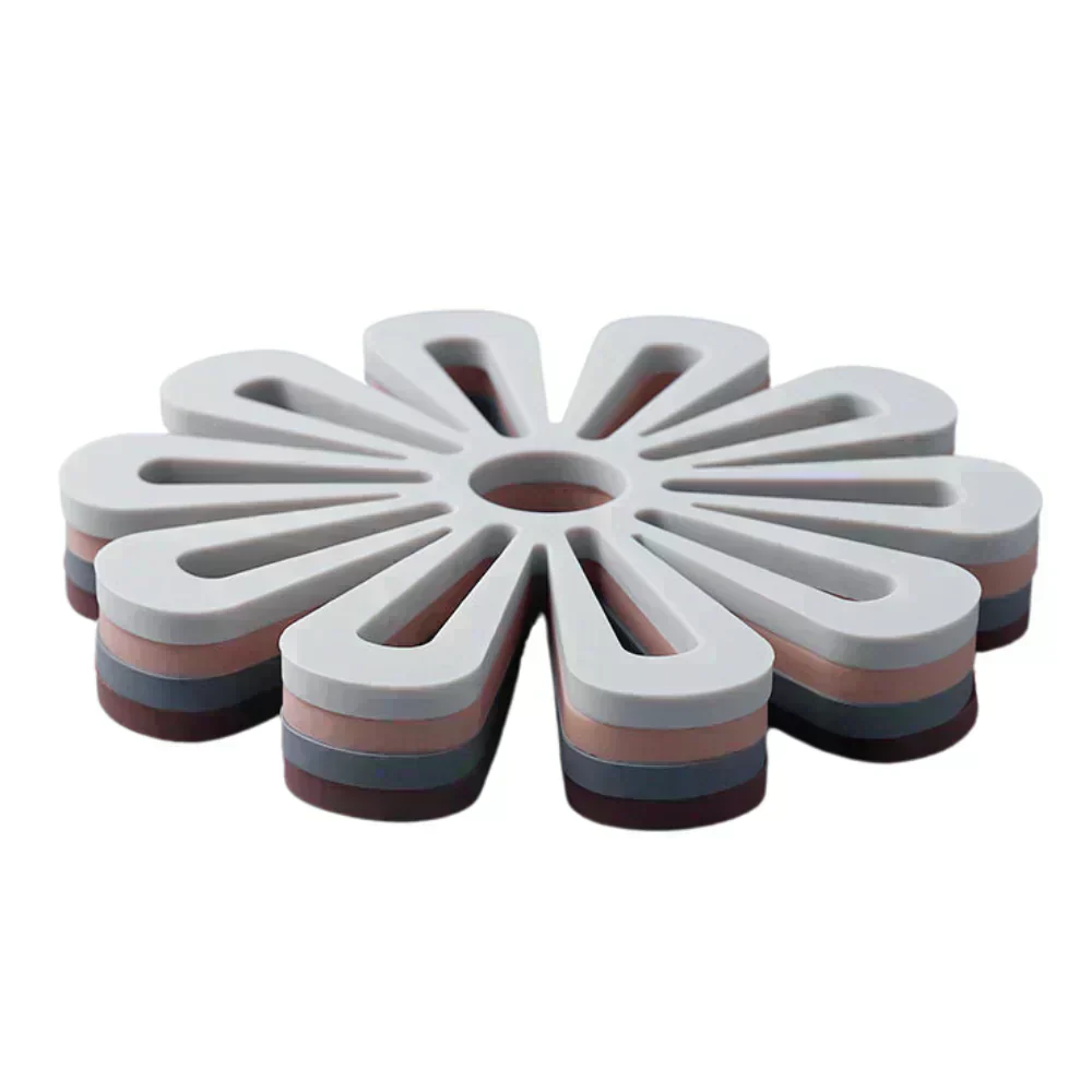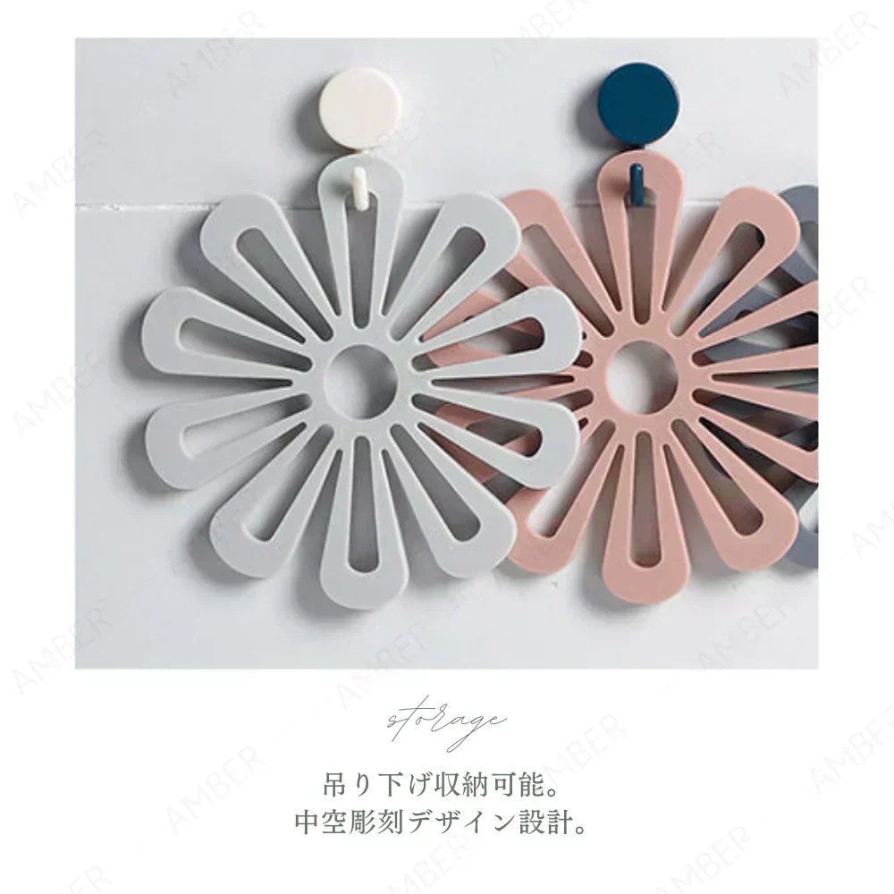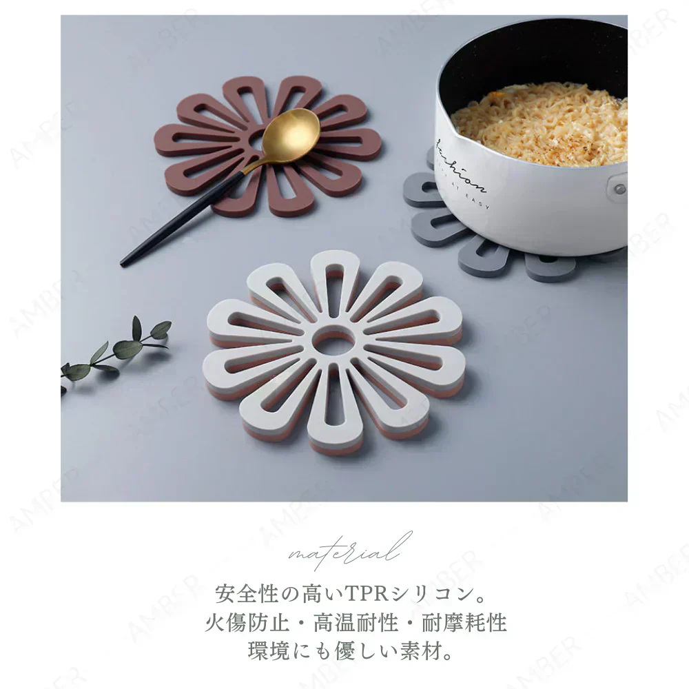 ・人気のおしゃれなキッチン雑貨、フラワーモチーフのシリコン鍋敷きになります。