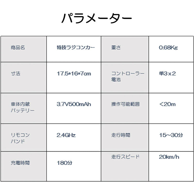 子供は大興奮間違いなしのラジコンカーです。車体はどちらの面が上に向いていても走れます。コマのように360度高速回転。障害物も簡単に乗り越え、傾斜45度の坂道も楽々走行。場所を選ばずどこでも爽快に走れます。ワイヤレスコントローラーで操作も簡単なので誰でも上手く走らせることが出来ます。