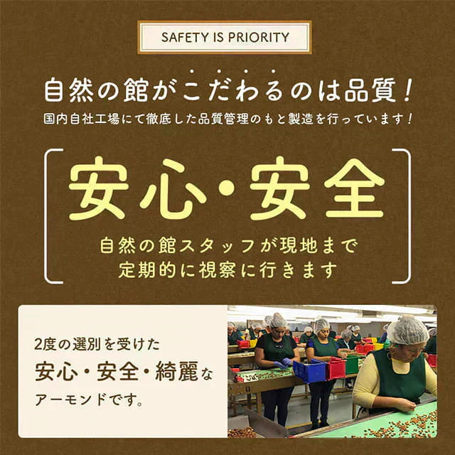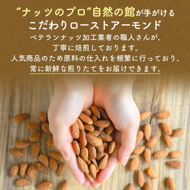 生のアーモンドに比べ水分含有量が低く、割れやすくなっているため、ご自宅用としてのご利用をおすすめします。
