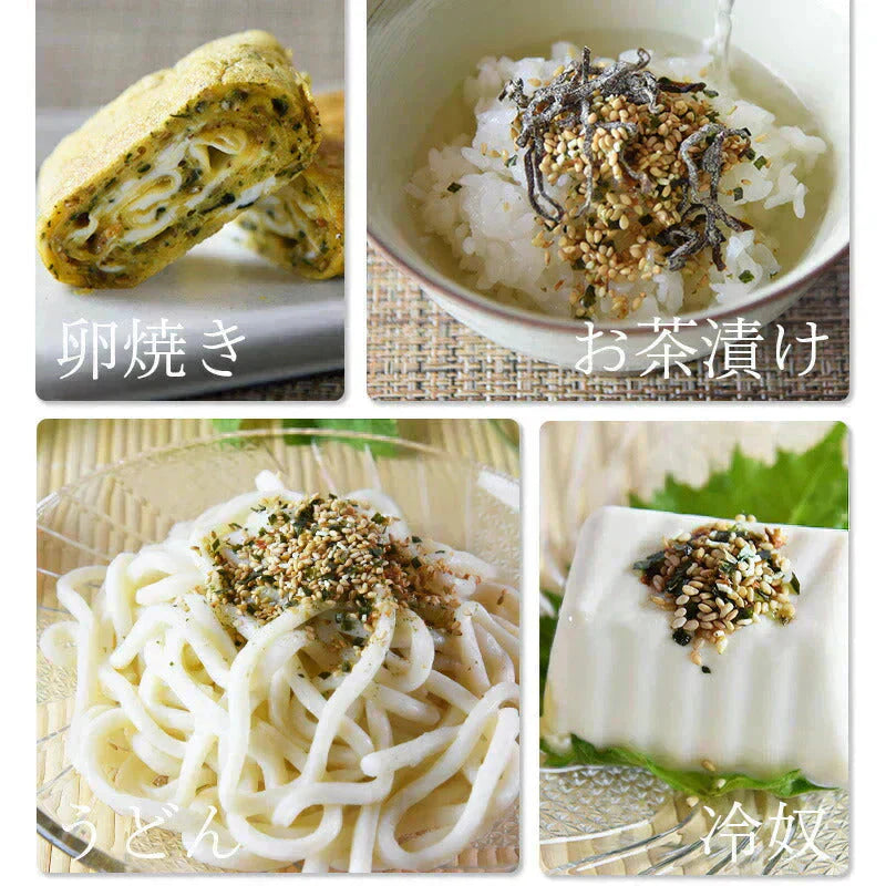 煎りごま(国内製造)、食塩、のり、砂糖、かつお削り節、醤油、乳糖、 澱粉、いわし、たん白加水分解物、ブドウ糖、抹茶粉末、昆布粉末、ジンジャー粉末、オニオン粉末、澱粉分解物/調味料(アミノ酸等)、酸化防止剤(V.E)、ベニバナ黄色素、クチナシ色素、香辛料抽出物、(一部に乳成分・小麦・大豆・ごまを含む)