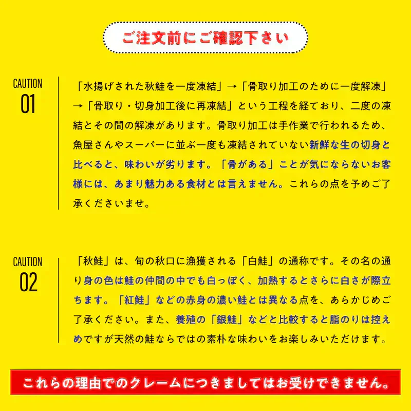 本製品は手作業で丁寧に骨を除去しておりますが、稀に残留している事もございますのでご注意ください。