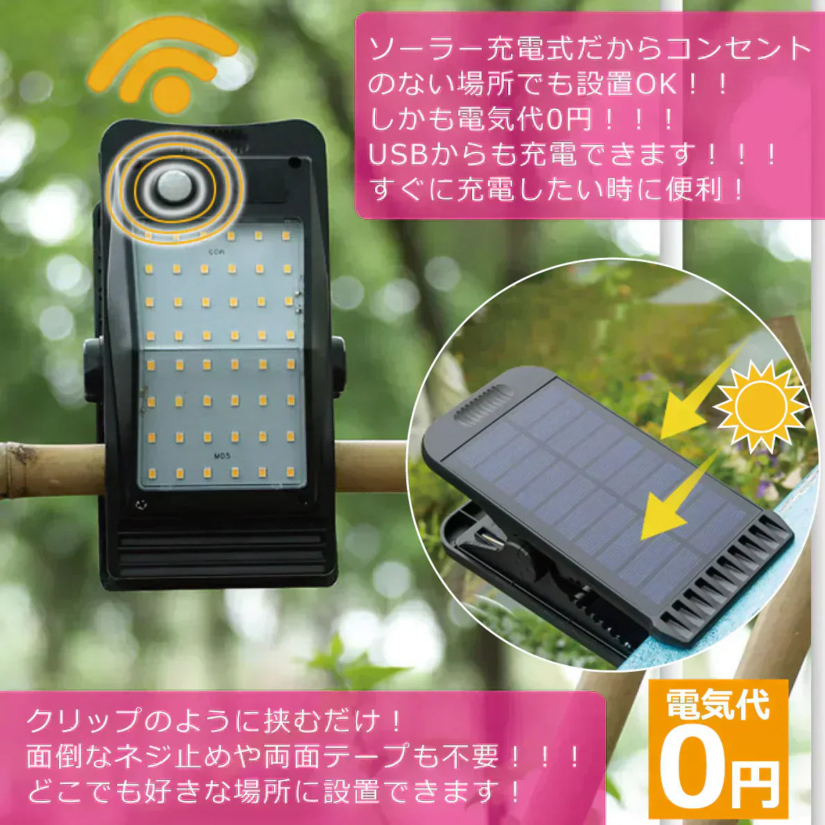 爆光!クリップ型ソーラーセンサーライト 懐中電灯 人感センサー ガーデンライト クリップ式 ソーラー充電 防犯ライト LEDライト