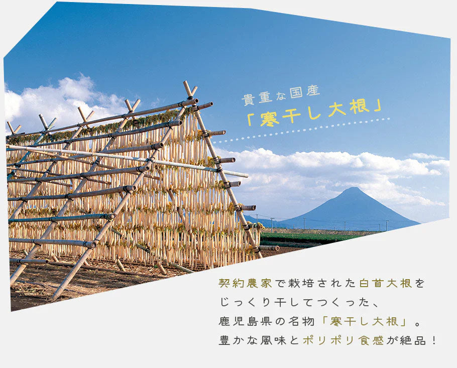 契約農家で栽培された白首大根をじっくり干して作った、国産の「寒干し大根」を使用。豊かな風味とポリポリの食感、老舗ならではのやさしく自然な味わいを楽しめます。