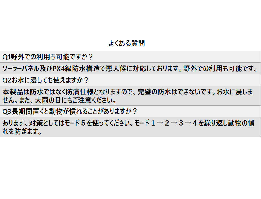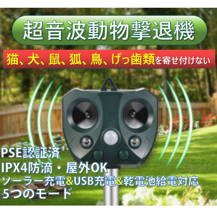 超音波とLEDライトで猫、ネズミ、犬、蛇、キツネ、アライグマ、アライグマ、アナグマ、スカンク、コウモリ、鳥、イノシシなどを寄せ付けない。