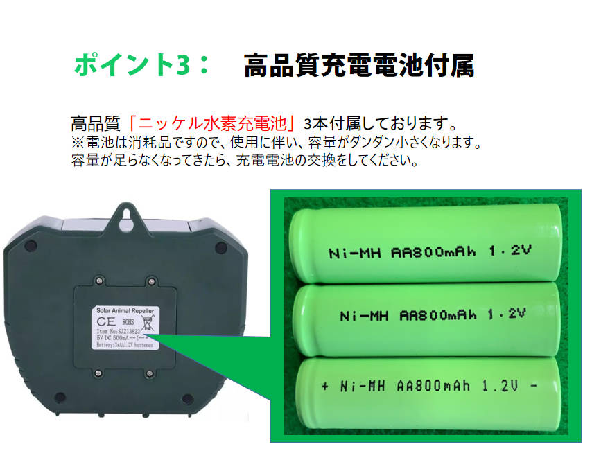 内蔵電池は高品質「ニッケル水素充電池」を採用。