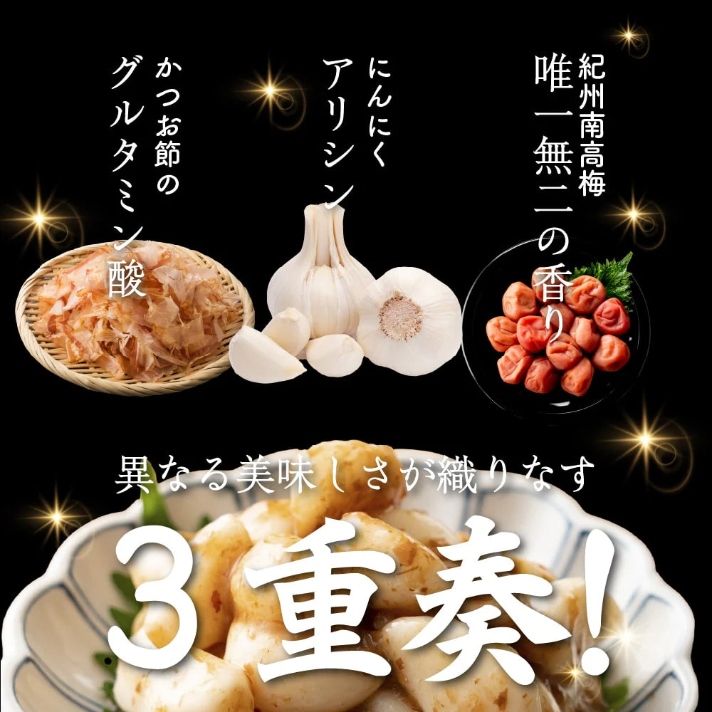 にんにく(中国)、かつおぶし、漬け原材料【梅肉、糖類、(砂糖、ぶどう糖果糖液糖)、発酵調味料、食塩、酵造酢、しょうゆ、酒精】調味料(アミノ酸等)、増粘多糖類、甘味料(スクラロース)、酸味料(原材料の一部に小麦を含む)