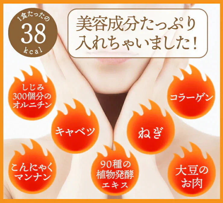 原材料名 砂糖、コラーゲンペプチド、食塩、ジンジャーパウダー、唐辛子、粉末醬油、ポークパウダー、ガーリックパウダー、チキンパウダー、オニオンパウダー、こんにゃく粉末、寒天粉末、胡椒、90種植物発酵エキス、オルニチン、植物油、