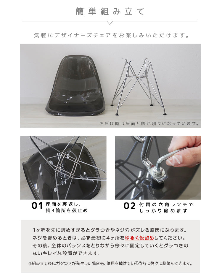 ・組立て後、脚にガタツキが生じた場合は通常使用している間に馴染んでいきますので、ご安心下さい。