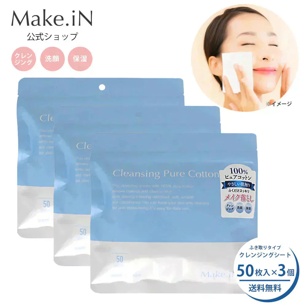 【3個セット】クレンジングシート 50枚 Make.iN ふきとりシート ピュアコットン うるおい メイク落とし クレンジング 洗顔 毛穴 角質 保湿 美容 スキンケア