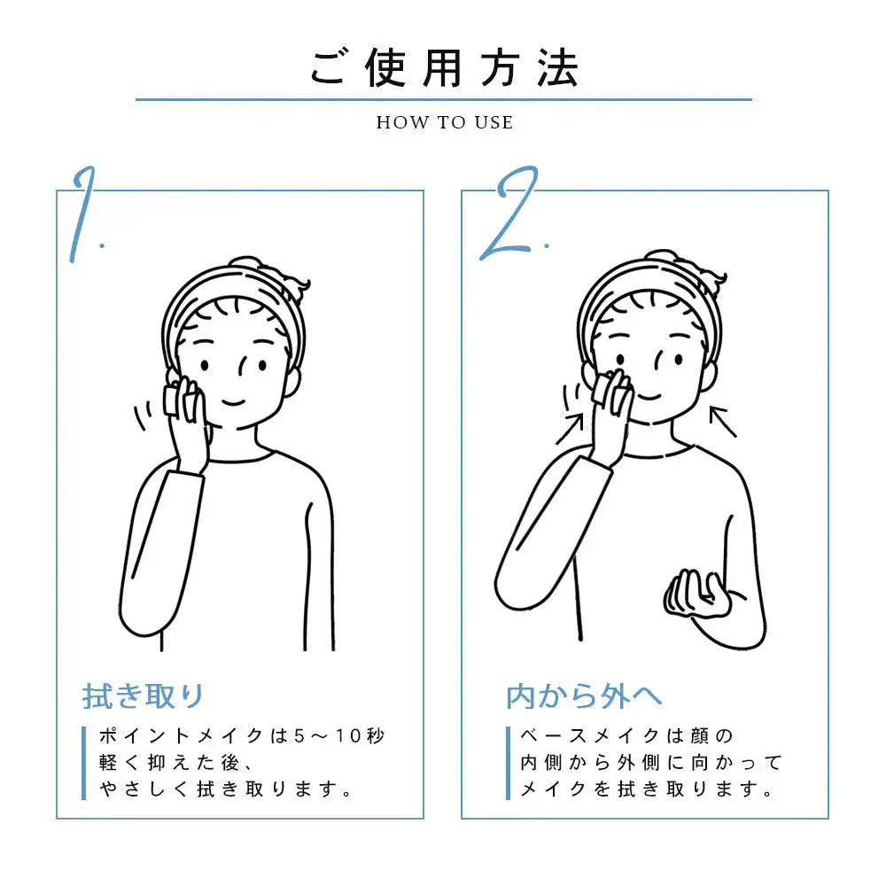 2.ベースメイクは顔の内側から外側に向かって、メイクをふき取ります。