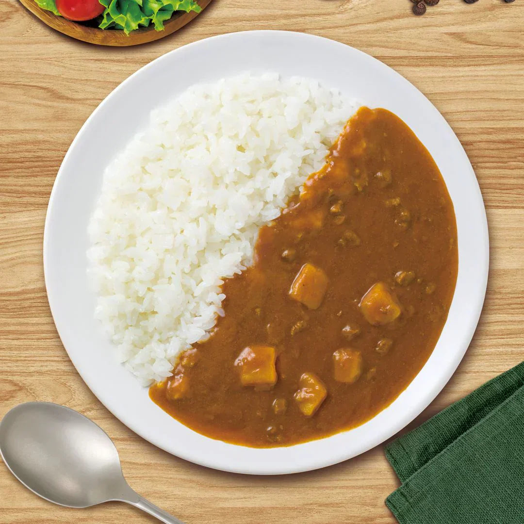 原材料	野菜(玉ねぎ(中国又は国産)、じゃがいも)、豚脂、小麦粉、砂糖、りんごペースト、トマトペースト、カレー粉、食塩、粒状大豆たん白、ビーフエキス、ウスターソース、チャツネ、にんにくペースト、クリーム加工品、唐辛子/増粘剤(加工でん粉)、調味料(アミノ酸等)、着色料(カラメル、ココア)、香料、酸味料、(一部に小麦・乳成分・牛肉・大豆・りんごを含む)