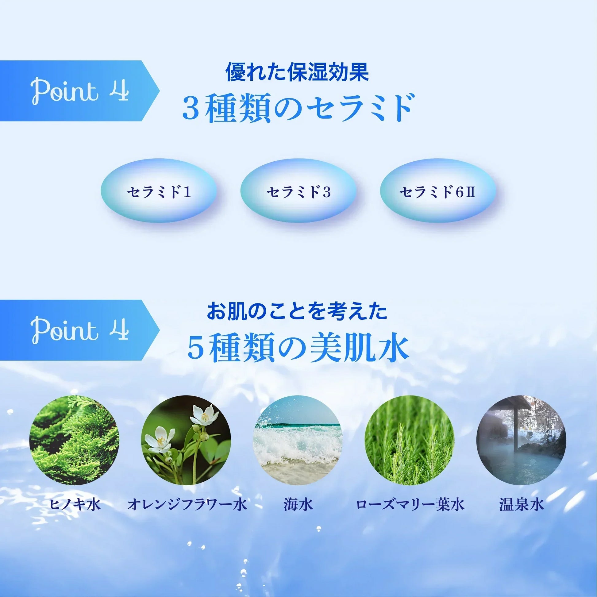 成分 水、ジメチコン、BG、シクロペンタシロキサン、DPG、グリセリン、(ジメチコン/(PEG-10/15))クロスポリマー、(ジメチコン/ビニルジメチコン)クロスポリマー、プルラン、マルチトール、ヒノキ水、ローズマリー葉水、オレンジフラワー水、PCA-Na、アスコルビルグルコシド、アルギニン、アスパラギン酸、PCA、グリシン、アラニン、ヒアルロン酸Na、セリン、バリン、イソロイシン、トレオニン、プロリン、ヒスチジン、フェニルアラニン、ポリクオタニウム-51、水溶性コラーゲン、グリチルリチン酸2K、セラミド3、コレステロール、セラミド6ll、フィトスフィンゴシン、セラミド1、塩化Na、海水、温泉水、乳酸Na、カルボマー、キサンタンガム、ラウロイル乳酸Na、クエン酸Na、クエン酸、トコフェロール、ペンテト酸5Na、フェノキシエタノール、メチルパラベン、エチルパラベン、プロピルパラベン